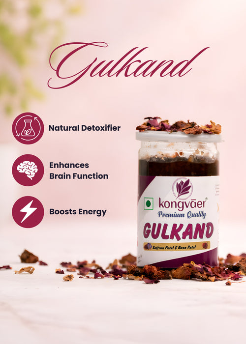 Made from Kashmiri rose petals, organic honey, and saffron flower petals, Kongvaer Gulkand is a nutrient-dense treat packed with antioxidants. This delightful blend not only satisfies your sweet cravings but also offers numerous health benefits. It effectively relieves constipation, alleviates menstrual problems, and treats acidity and heartburn. Indulge in Kongvaer Gulkand for a delicious way to support your overall well-being.