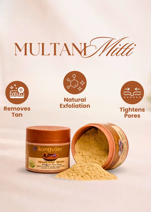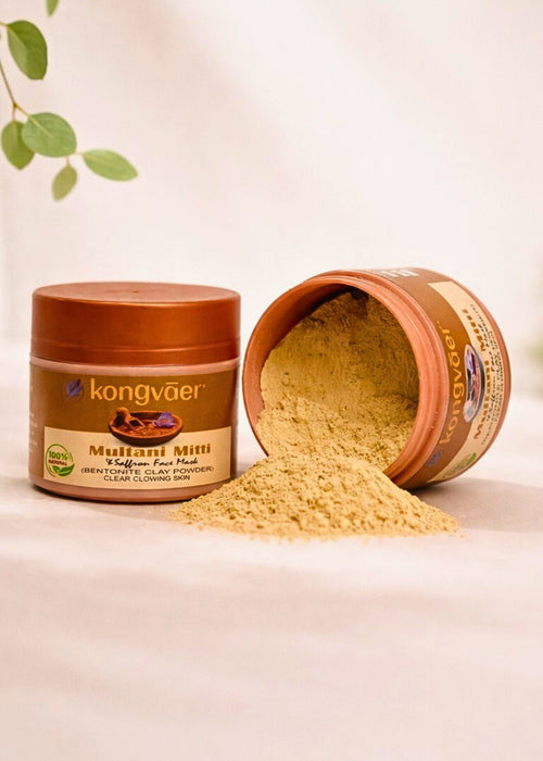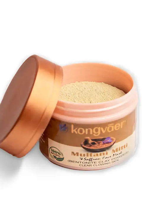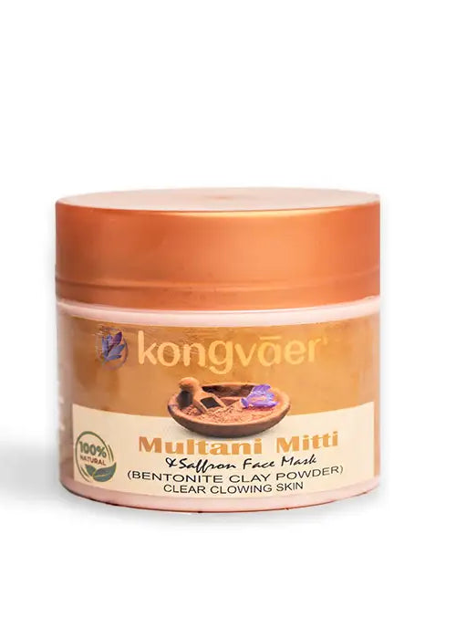 Multani Mitti, also known as Fuller's Earth, is a natural skincare remedy celebrated for its purifying and skin-brightening properties. Enriched with saffron, Kongvaer Multani Mitti protects against acne, repairs damaged skin, and removes blackheads. This clay deeply cleanses pores and improves skin tone, leaving your skin refreshed and radiant. Incorporate Multani Mitti into your skincare routine for a clearer, healthier complexion.